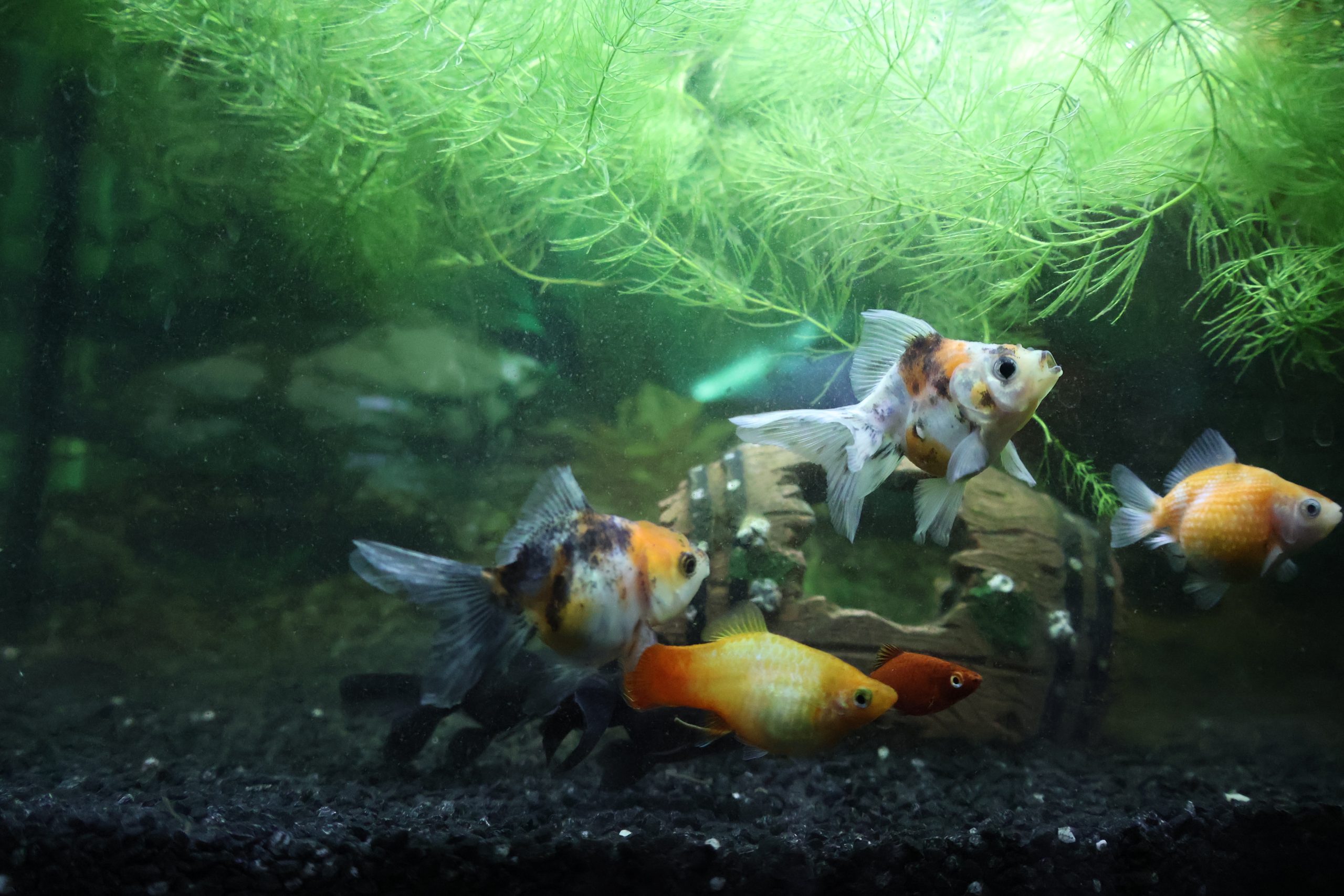 Gold fish photo under low light condition while those fishes are swimming around